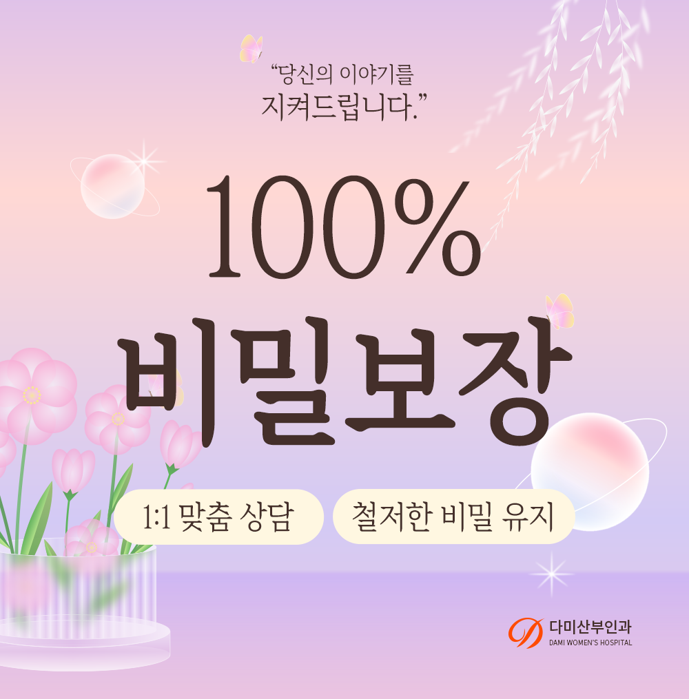 다미산부인과는 100% 비밀보장을 원칙으로 하고 있습니다.