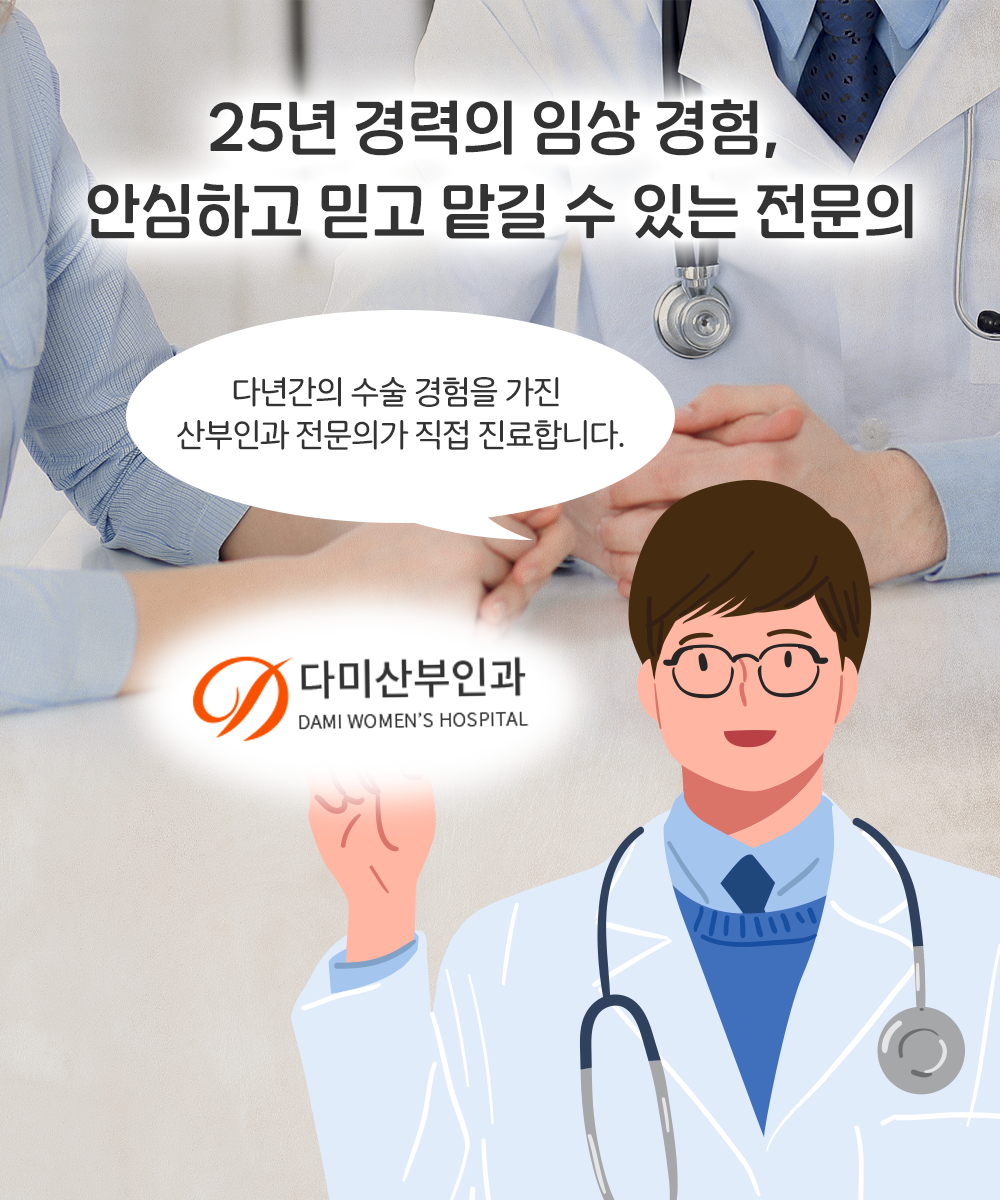 다미산부인과는 25년 이상 현장에서 임상 경험을 쌓아 온 산부인과 전문의가 상담부터 시술과 회복, 이후의 피임 상담까지 직접 이어갑니다.