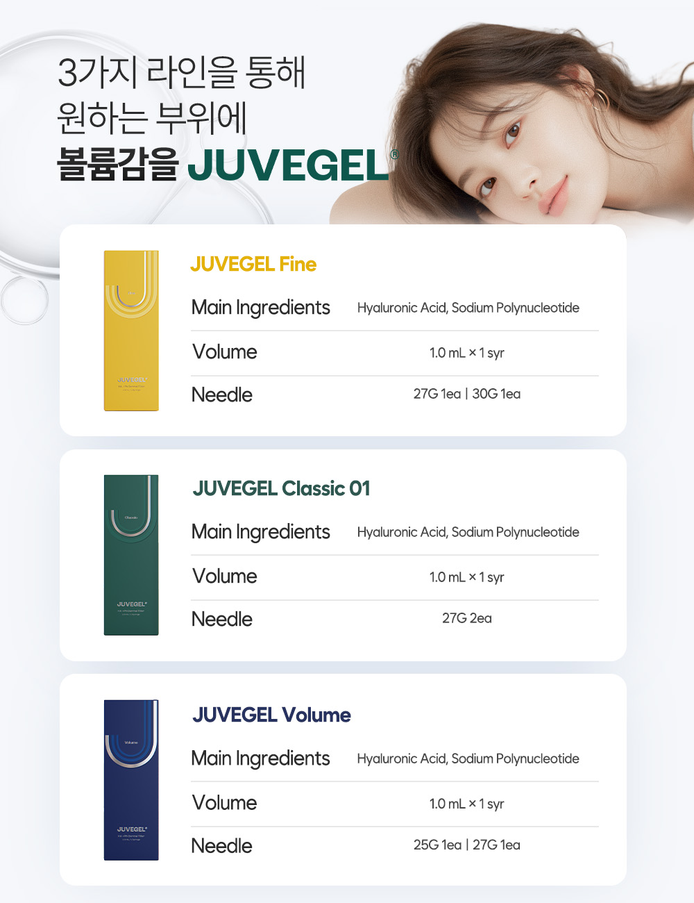 쥬브겔은 시술 부위의 특성에 맞춰 Fine / Classic / Volume 3가지 라인으로 구성되어 있습니다.