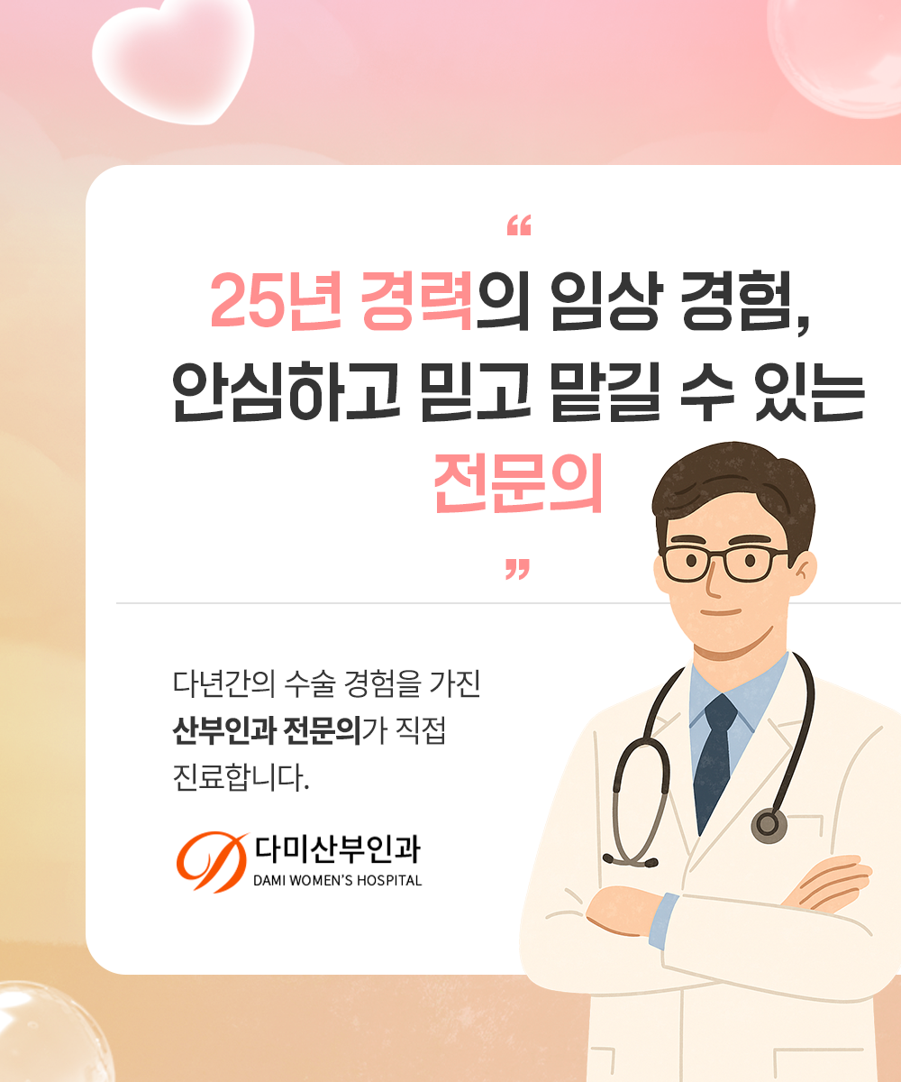 다미산부인과는 25년의 풍부한 경력과 다년간의 수술 경험을 가진 산부인과 전문의가 직접 진료합니다.