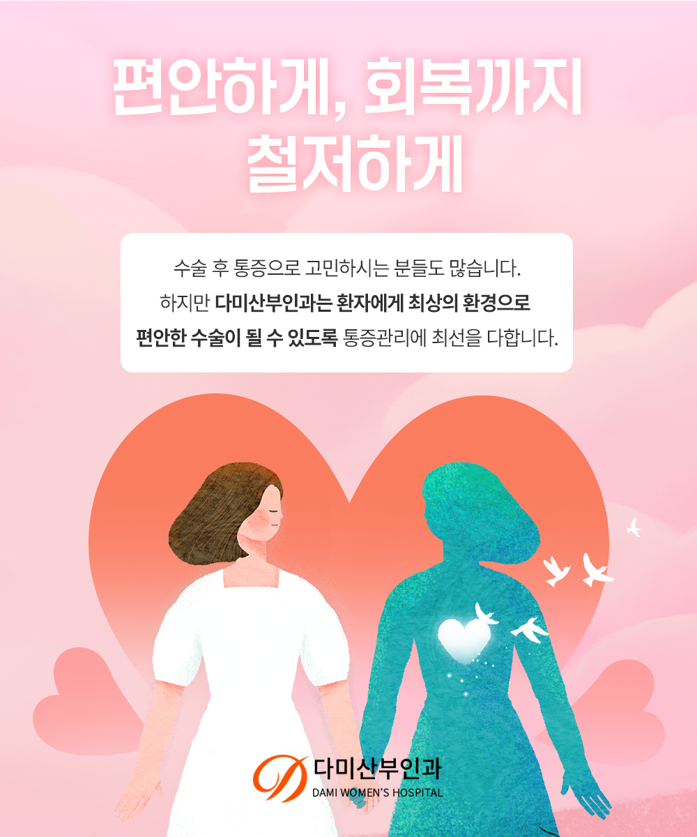 다미산부인과는 환자분들이 최상의 환경에서 편안한 수술을 받으실 수 있도록 통증 관리에 최선을 다하고 있습니다.