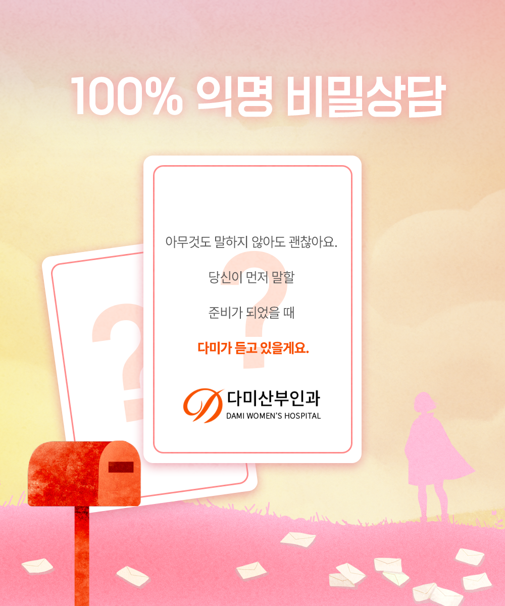 다미산부인과는 환자분들의 사정을 깊이 헤아려 100% 익명 비밀상담을 철저하게 보장합니다.