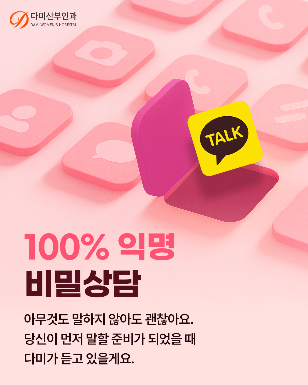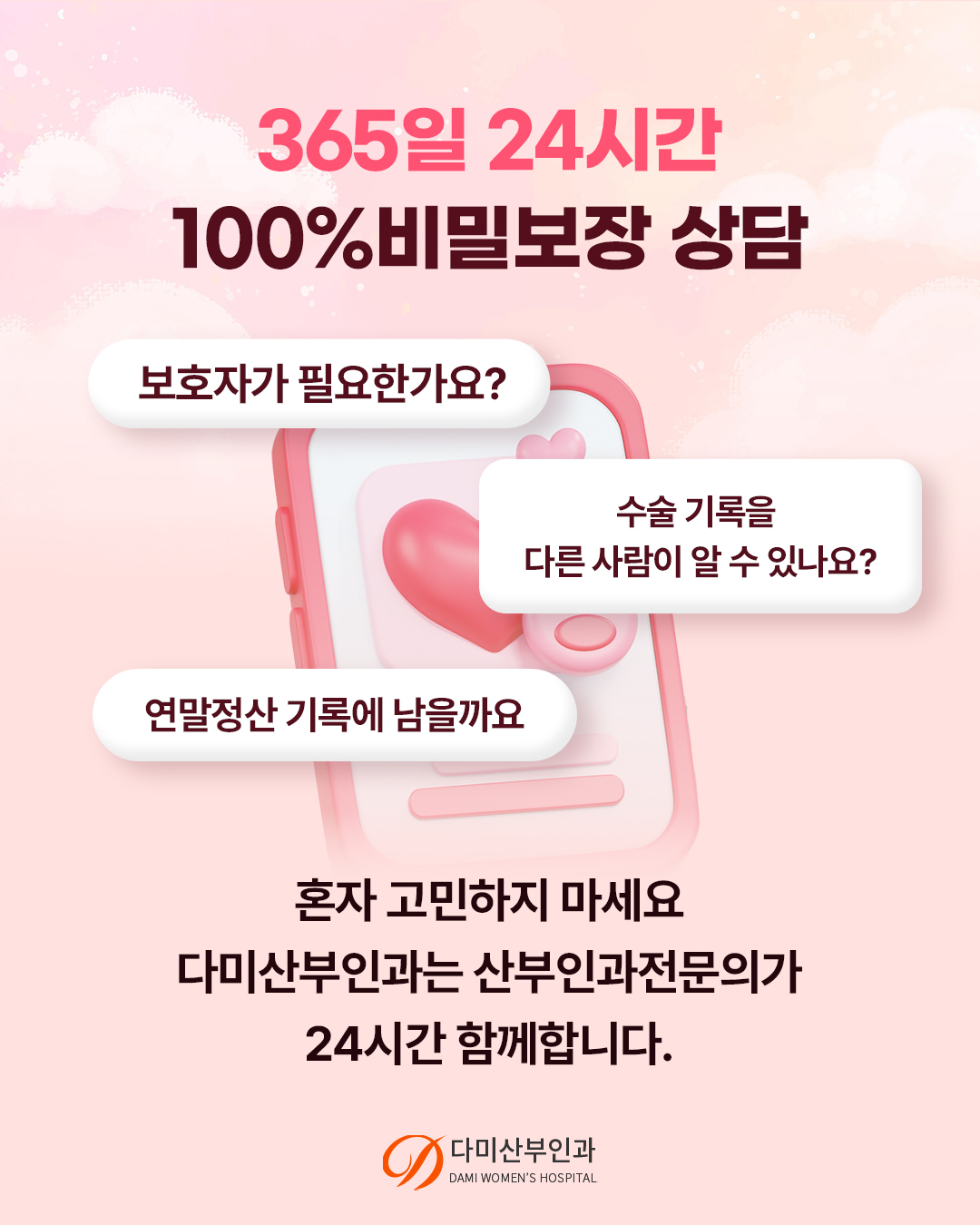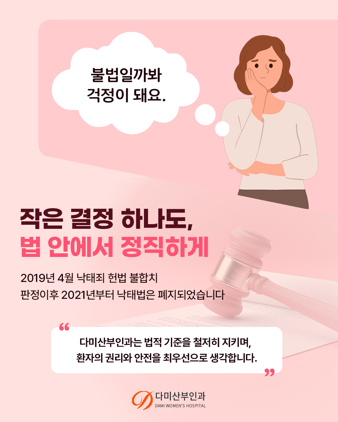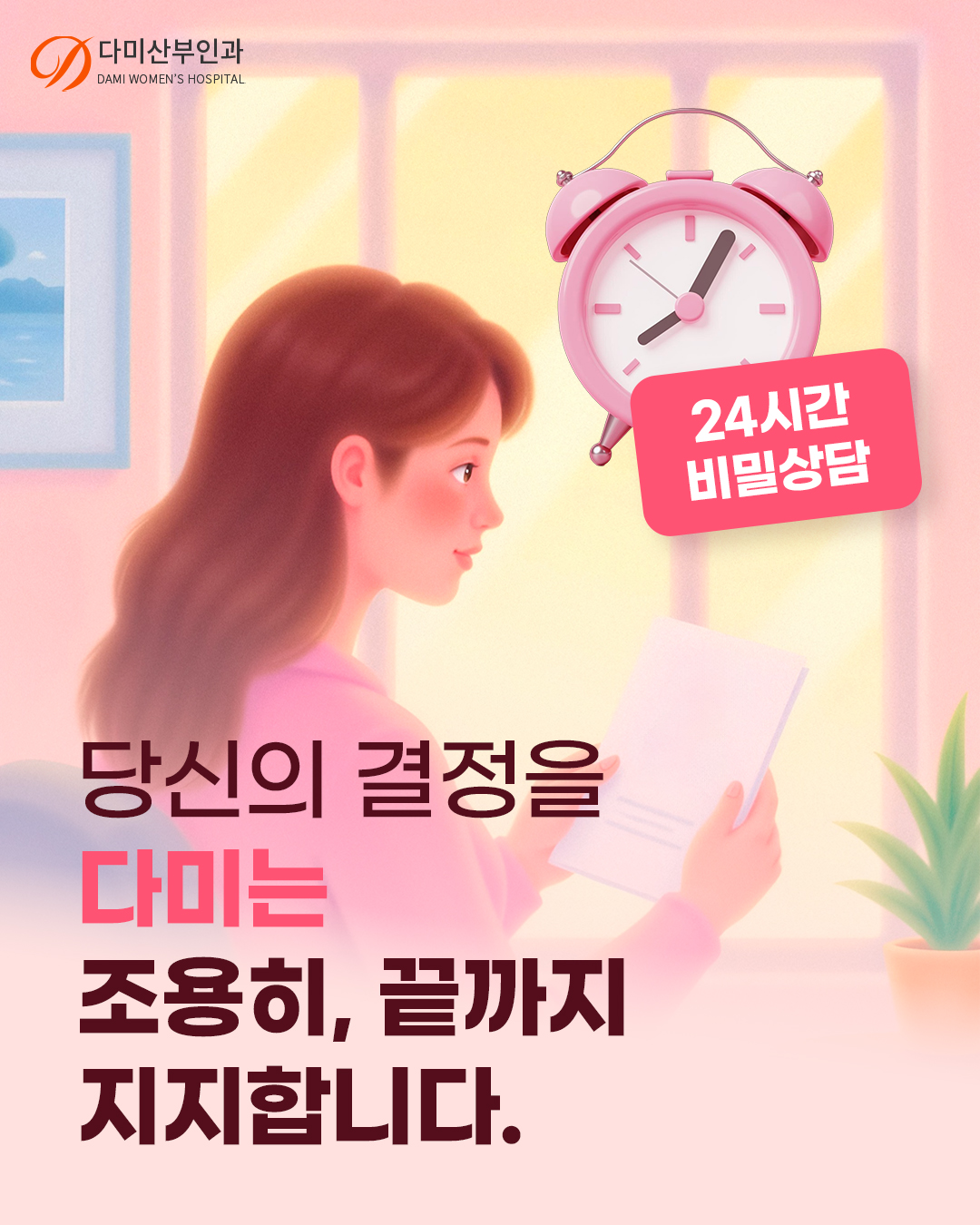 당신의 결정이 후회로 남지 않도록 다미산부인과는 조용히 그리고 끝까지 당신을 지지하고 응원합니다.