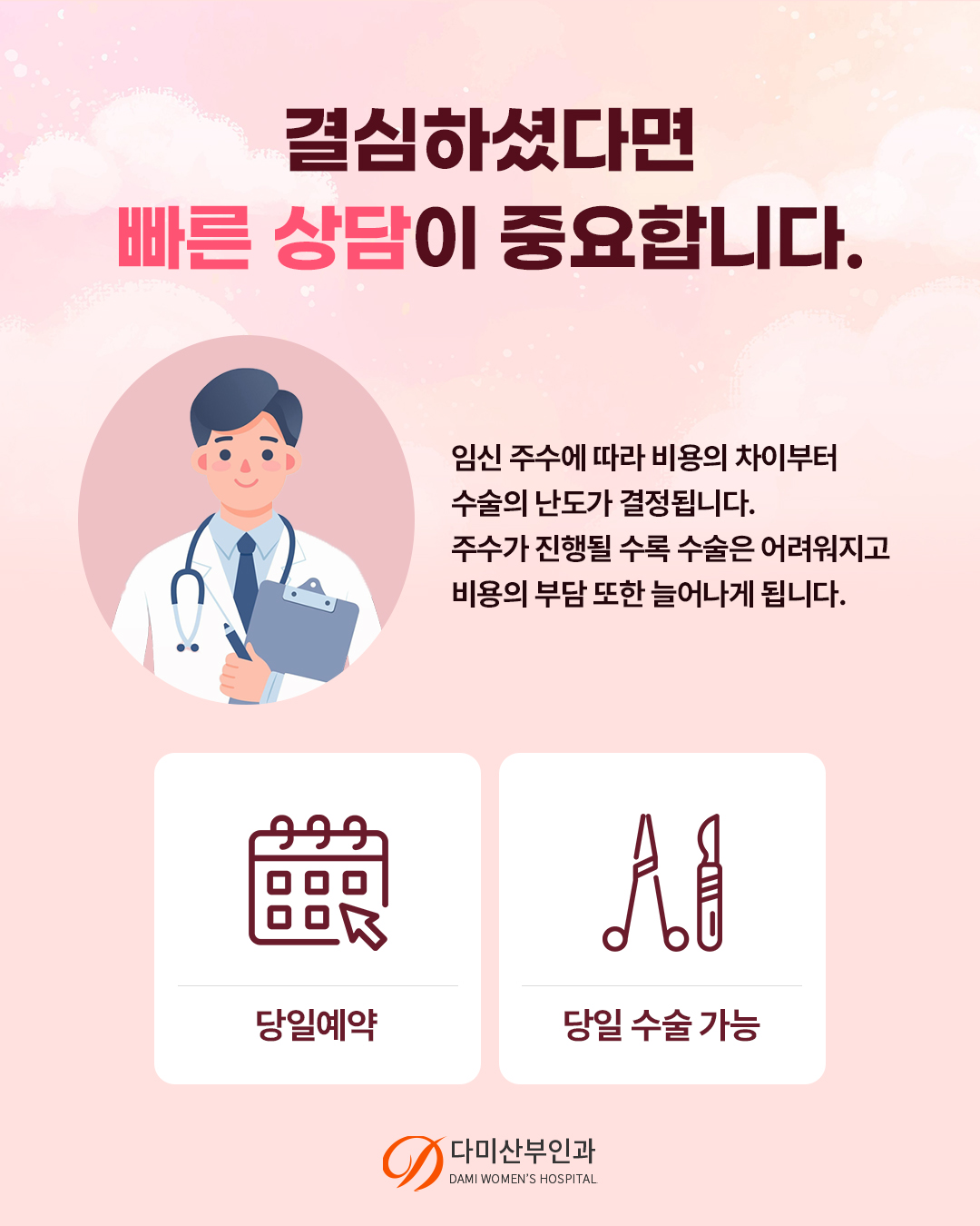 다미산부인과는 환자분들의 절박한 상황을 고려하여 당일 예약 및 당일 수술 시스템으로 운영하고 있습니다.