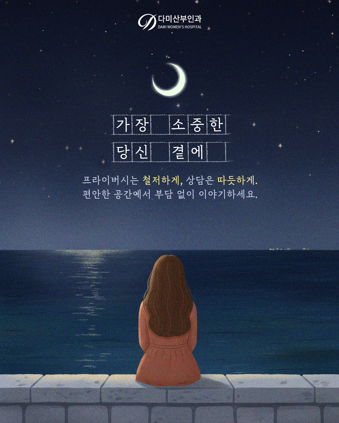 언제 어느 때라도 당신의 편에 온전히 서서 조용하고 따뜻하게 당신의 숨겨둔 이야기를 귀 기울여 들어줄 만반의 준비가 되어 있으니 부디 아무런 걱정 하지 마시고 마음 편히 다미산부인과로 연락 주시기를 기다리겠습니다.
