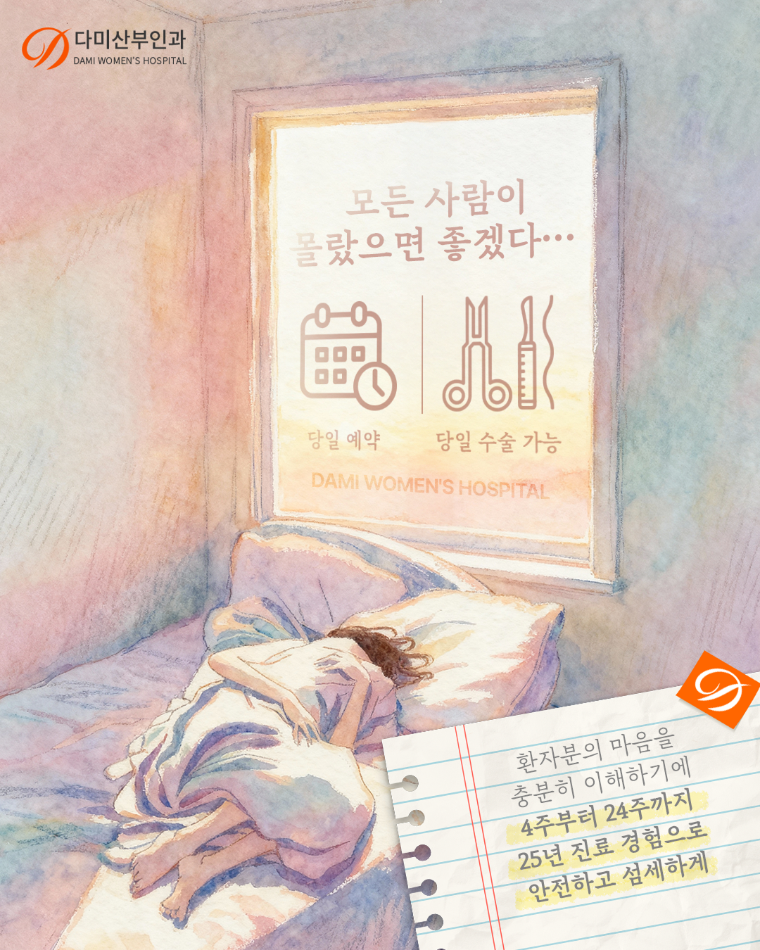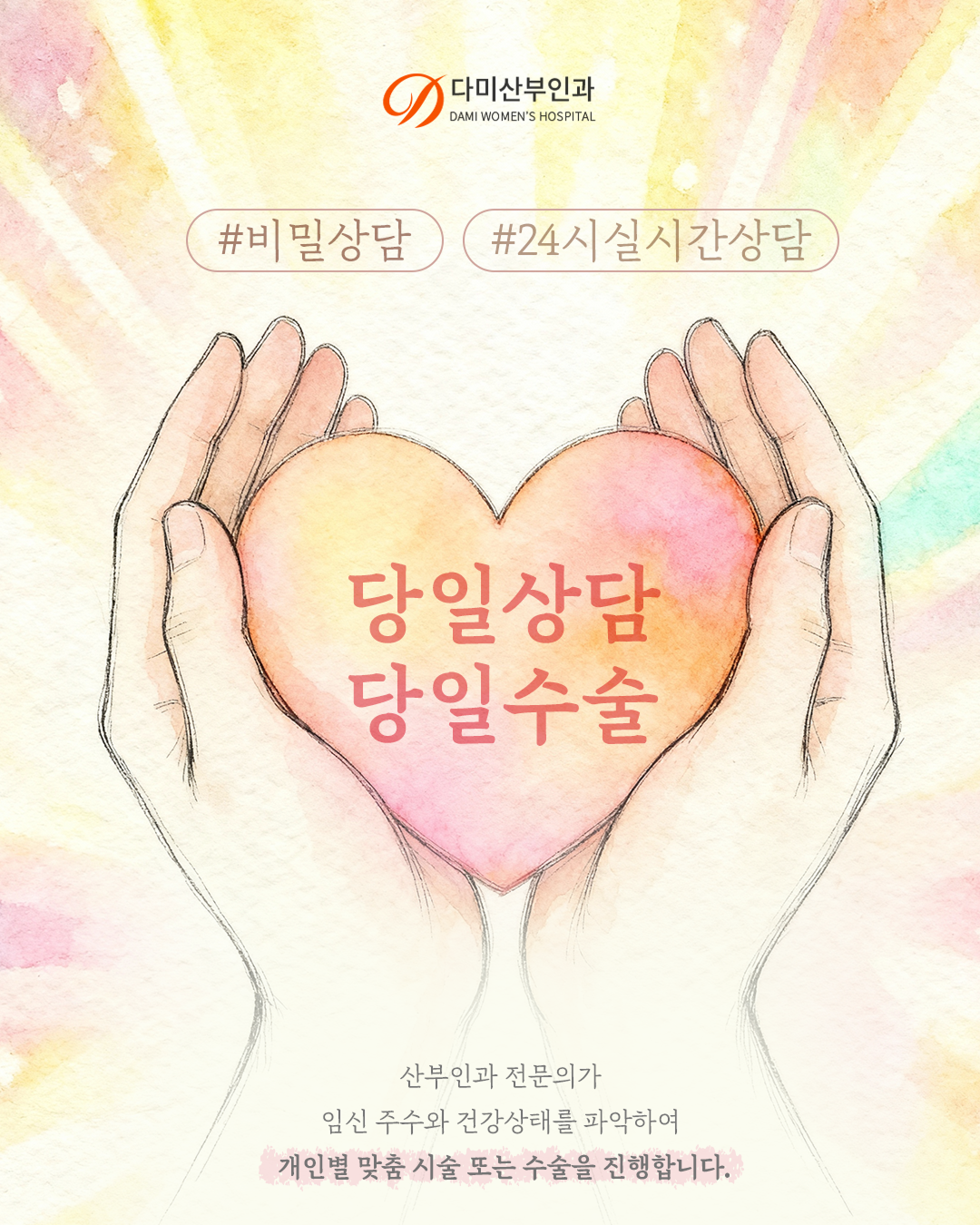 다미산부인과는 수술만을 진행하는 곳이 아니라 환자분이 처한 현실적인 어려움과 법적인 고민 그리고 심리적인 갈등까지 모두 세심하게 귀 기울여 듣고 가장 합리적이고 안전한 길을 제시해 드리는 든든한 조력자 역할을 다하고 있으니 부디 안심하시고 저희를 믿어 주시기를 바랍니다.